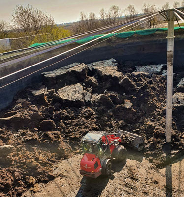 Bei sandigen Böden und Fütterung mit Grassilage ist dann auch ein Berg unter dem Futtereintrag keine Überraschung wie auf dem Bild links.