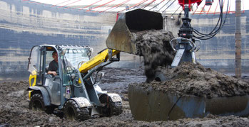 Nach Aufbau des Baggers werden 2 stabile Stahlmulden (Schlepper oder LKW) benötigt, die im Rundlauf die Sedimente etc. abfahren. Es wird zunächst eine Stelle freigebaggert, in die der 2to. Radlader durch den Bagger eingesetzt werden kann.