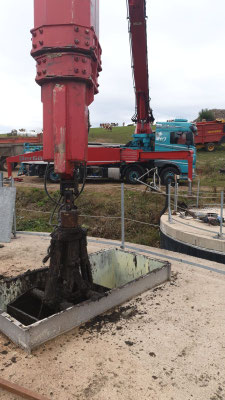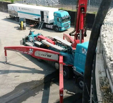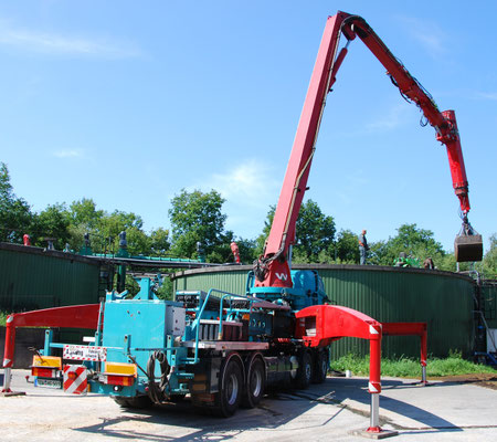 Der Vierachser mit Liebherr Aufbau wird als Behälterbagger vor allem für Behälter mit Betondecken eingesetzt. Mit seiner hydraulisch betriebenen Schneckenpumpe Wangen ELEPHANT kann er zudem auch Fermenter und andere Behälter auspumpen. Deutschlandweit rückt der Alleskönner vor allem bei Havarien oder zu Revisionsarbeiten an derartigen Anlagen aus.
