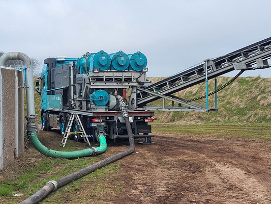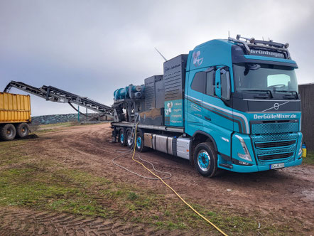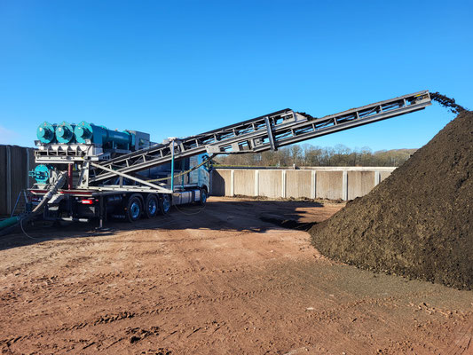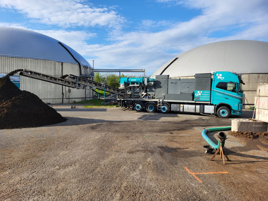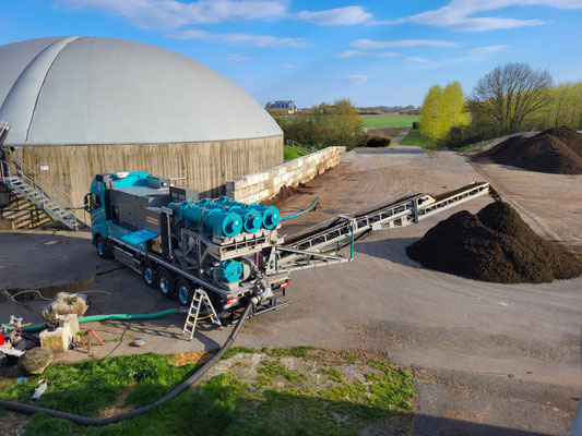 separiert werden. Der Separator zieht bis zu 360 cbm/Std durch und gibt bis zu 120 cbm/Std abgepressten Gärrest über ein Förderband ab.