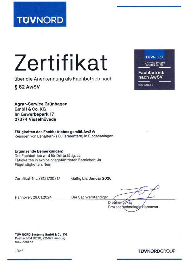 Das Reinigen und damit auch die Fermenterreinigung von Biogasanlagen sind fachbetriebspflichtige Tätigkeiten (§ 45 AwSV Verordnung über Anlagen zum Umgang mit wassergefährdenden Stoffen).